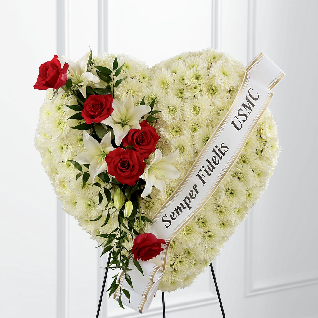 Express your condolences with an arrangement that beautifully expresses comfort and honor within each bloom. Our Heartfelt Hero Standing Heart is made of a collection of cushion pompons, and accented with roses and lilies. To bring it all together, this breathtaking piece comes personalized with a printed ribbon.